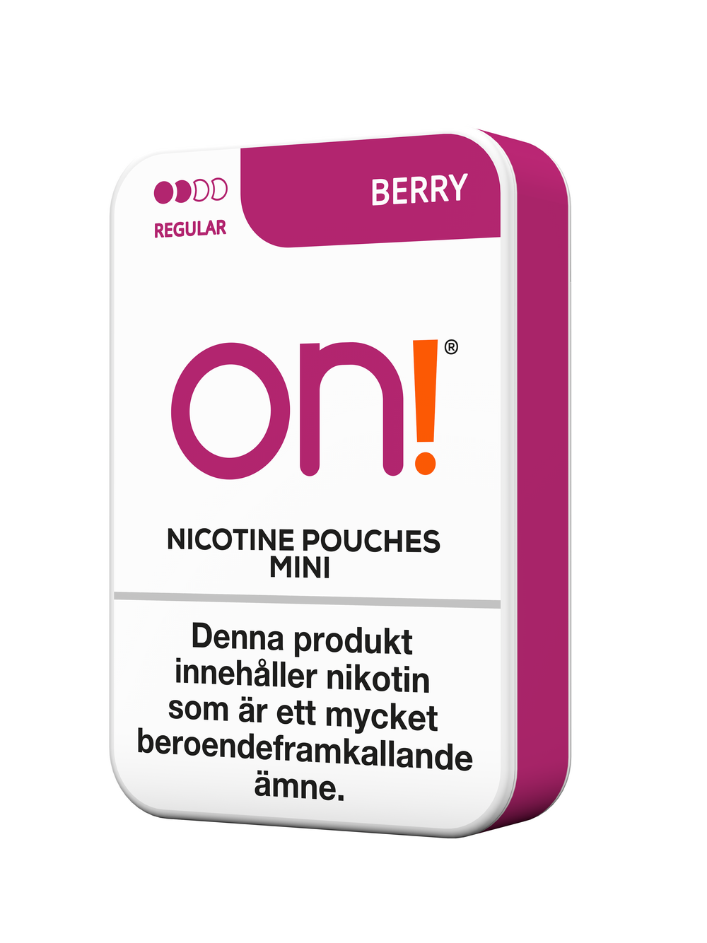 on! Berry Regular är vita tobaksfria nikotinpåsar med smak av vinbär och björnbär. De torra portionerna kommer i mini format.