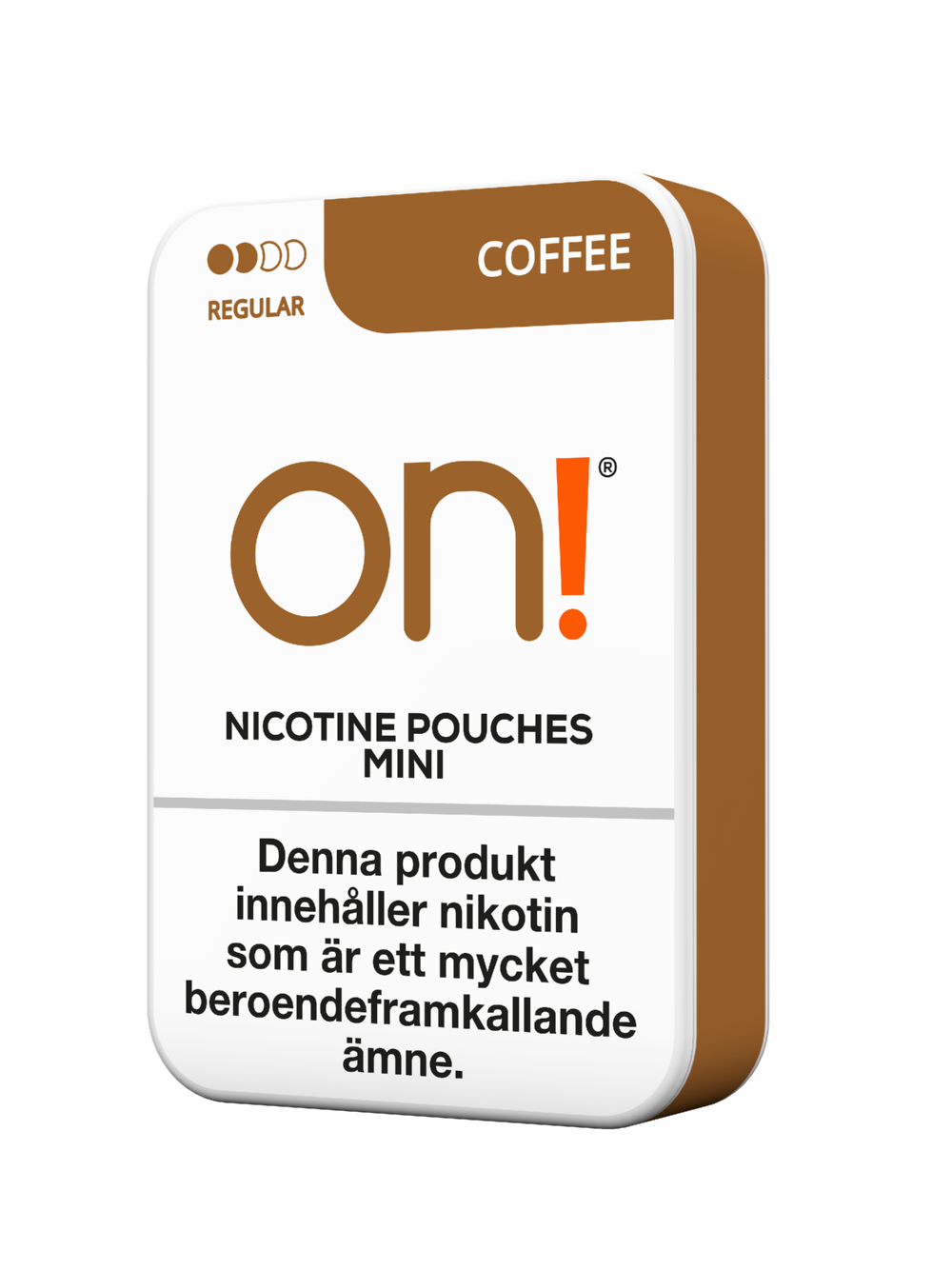 Hoppa till innehållOn! Coffee 3 mg. En lite mildare nikotinpåse för dig som gillar kaffesmak. Den goda kaffesmaken och nikotinet frigörs så fort de vita, torra påsarna blivit lite fuktiga. On! produkterna kommer i små diskreta miniportioner och passar framförallt dig som inte vill att det ska kännas eller synas särskilt mycket.