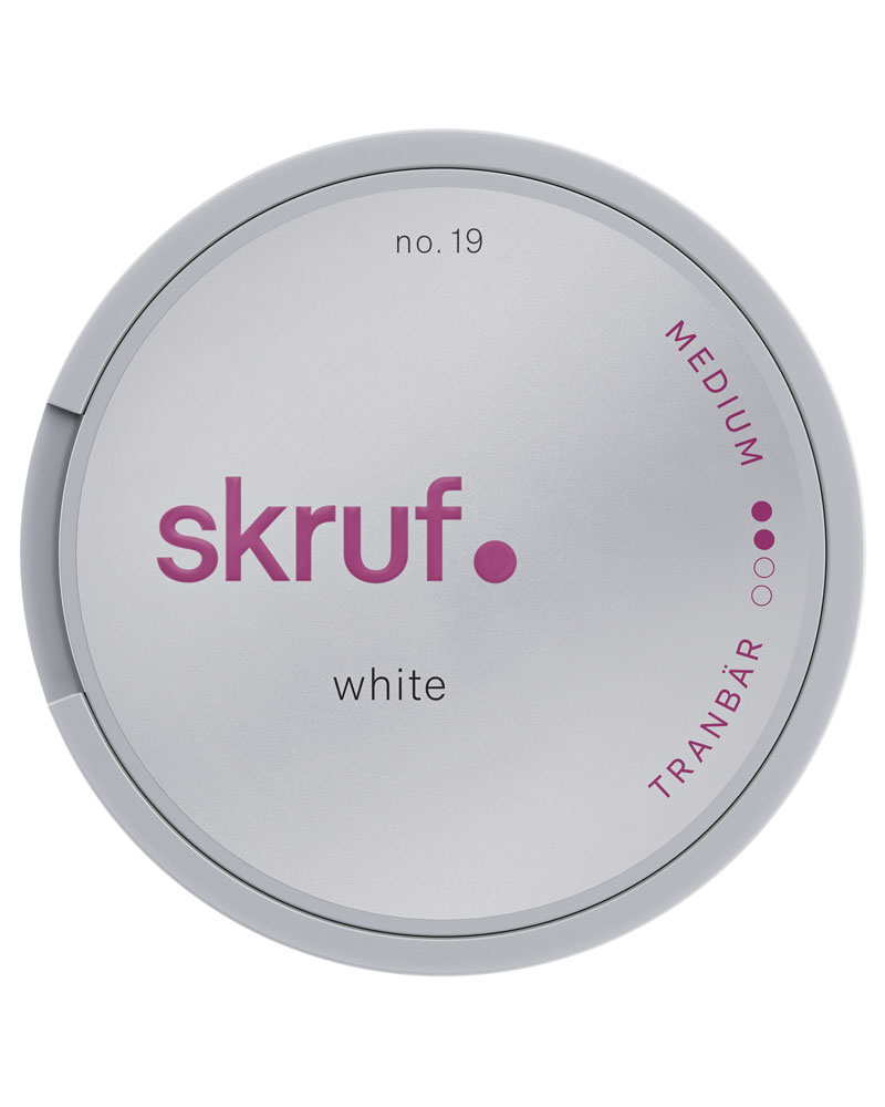 Skruf no. 19 Tranbär Medium är ett snus med en ren och mild tobakssmak. Smaken har inslag av tranbär i kombination med dova toner av tobak.