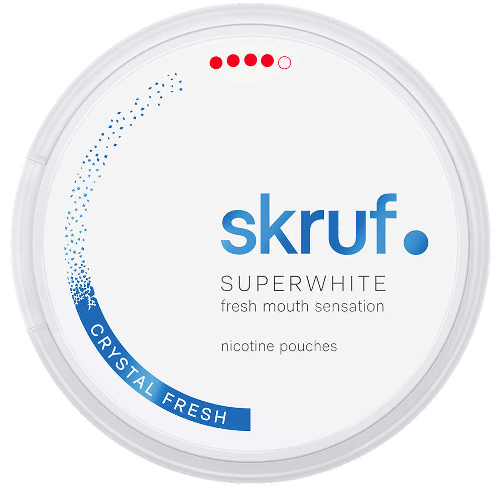 Skruf SUPERWHITE Crystal Fresh Extra Strong är ett tobaksfritt vitt snus i slim-format med en iskallt fräsch smak av mint och eukalyptus, där den svalkande känslan sitter i länge. Varje dosa innehåller 24 prillor och levererar en extra stark nikotinkick på cirka 12 mg nikotin per prilla (16,6 mg/g).