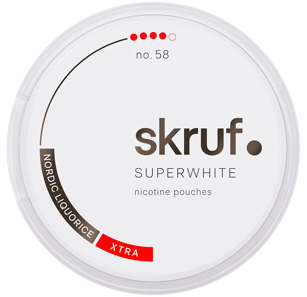 Skruf SUPERWHITE No. 58 Nordic Liquorice Xtra Strong är ett tobaksfritt vitt snus i slim-format med en tydlig, nordisk smak av salt lakrits och en fräsch hint av mint. Dosan innehåller 24 prillor och har xtra stark styrka med cirka 12 mg nikotin per prilla (16,6 mg/g), perfekt när du vill ha både tryck och smak.