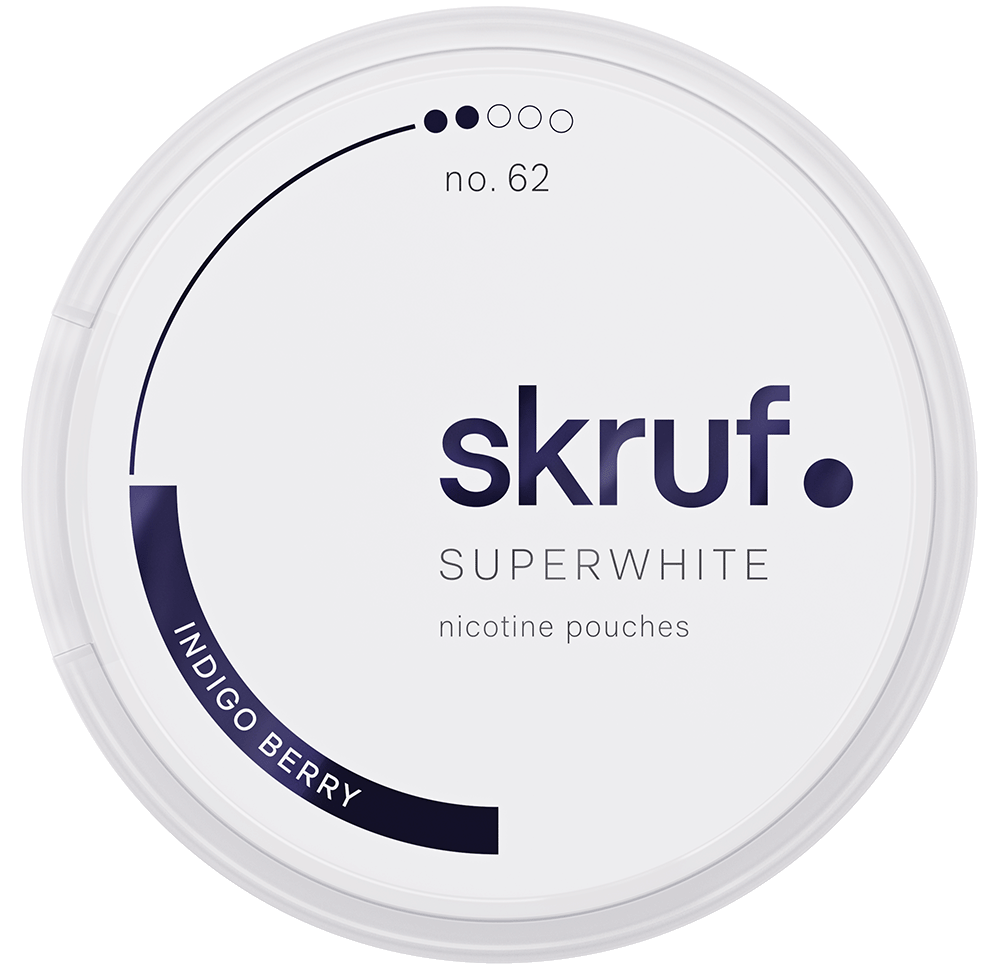 Skruf Superwhite no. 62 Indigo Berry Medium Strength är en all white i slimformat utan tobak med smak av björnbär och en hint av mint och lakrits.