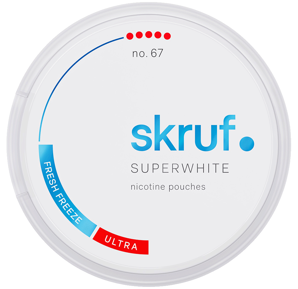 Skruf SUPERWHITE No. 67 Fresh Freeze Ultra Strong är ett tobaksfritt vitt snus i slim-format med en iskall och intensiv mintsmak som ger en rejäl “freeze”-känsla under läppen. Den har ultra stark styrka och passar perfekt för dig som vill ha maximal fräschör och en riktigt kraftfull nikotinkick.
