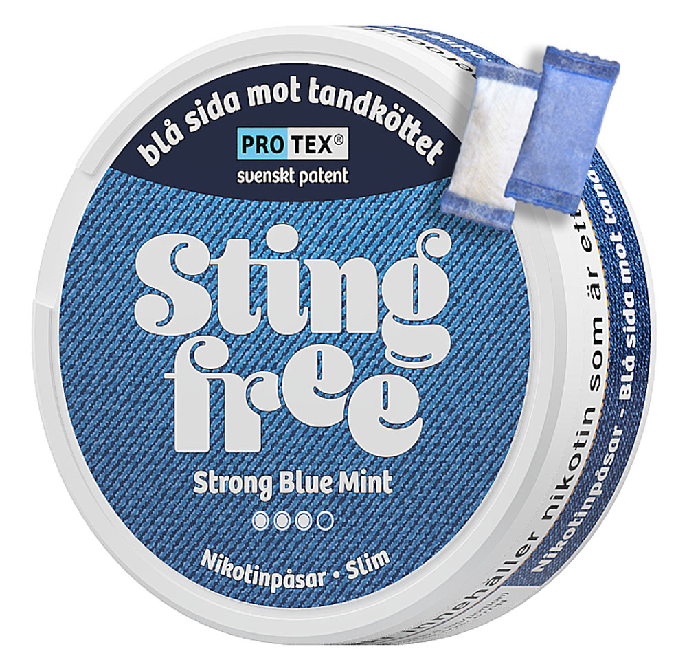 Stingfree med en frisk smak av Strong Blue Mint. Stingfree tar bort svedan genom att placera en skyddande barriär på tandköttssidan av påsen. Barriären skyddar tandköttet men smak, doft och nikotin kan fortfarande passera genom den oskyddade vita sidan av påsen.